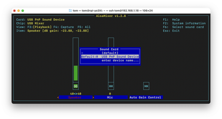 În consecință, în alsamixer va fi afișată doar interfața dorită, în acest caz un dongle USB: